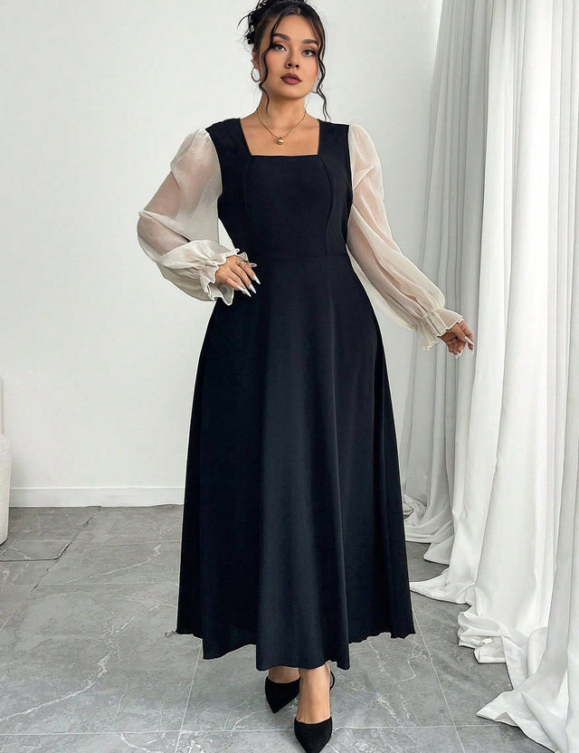 Women Plus Size Black Square Neck Sheer Sleeve Maxi Dress