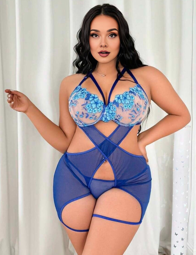 Step into pure allure with the Women Plus Size Blue Floral Embroidered Sheer Mesh Teddy Lingerie, a captivating piece that celebrates curves with confidence and charm. The delicate floral embroidery on the sheer cups adds a touch of romantic elegance, while the bold crisscross mesh design beautifully accentuates your waist and hips. Every detail — from the halter neckline to the high-cut leg straps — is crafted to enhance your silhouette and create a show-stopping, feminine look that’s both seductive and empowering.