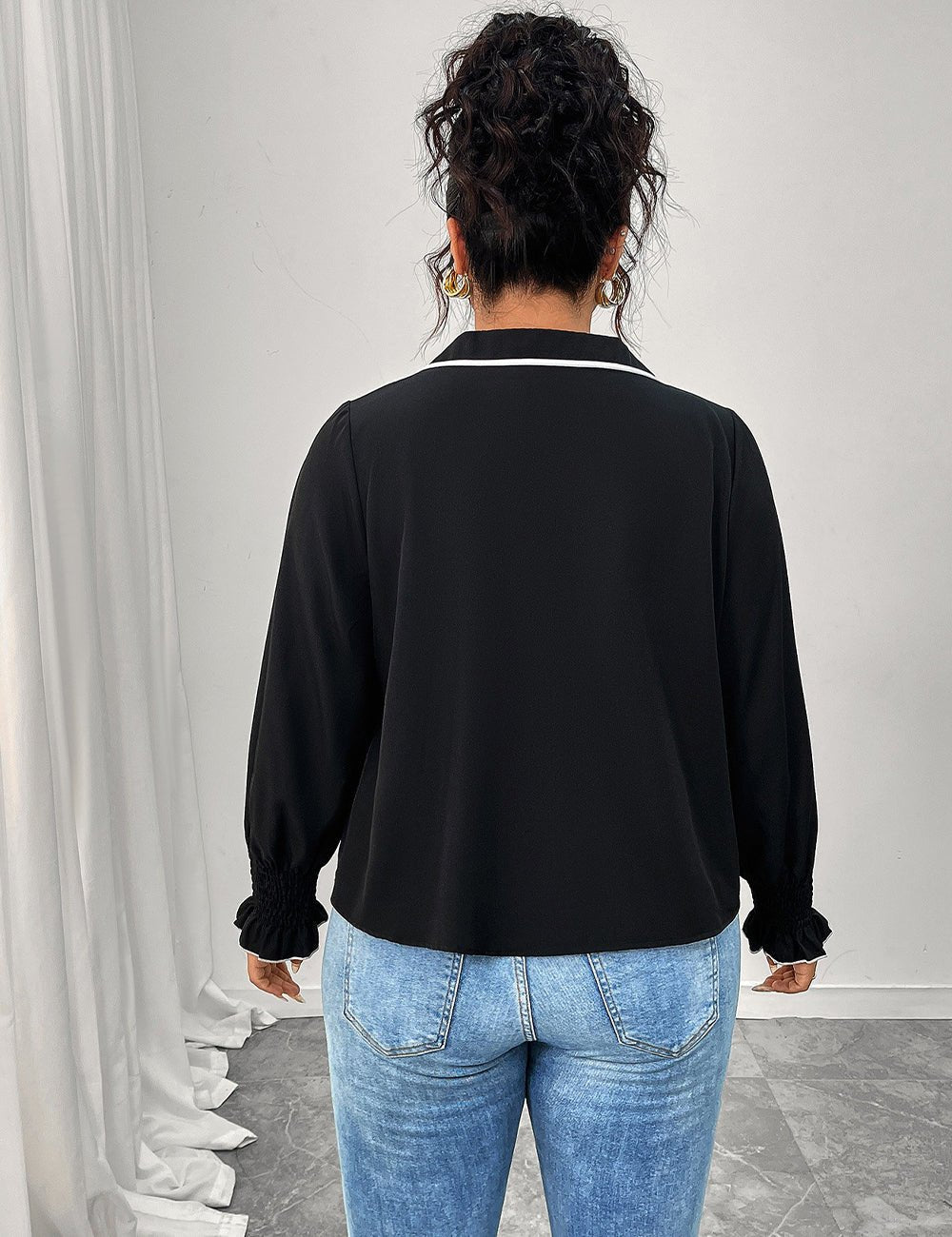 Women Plus Size Bow Decor Ruffle Hem Long Sleeve Shirt - Black / 1XL is backordered and will ship as soon as it is back in stock.