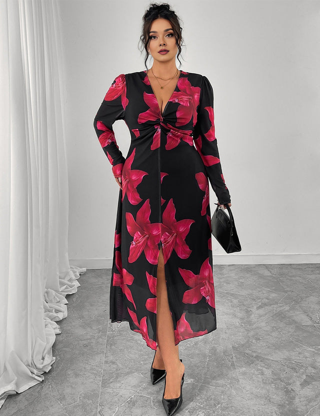 Women Plus Size Floral Print Twist Front V-Neck Maxi Dress