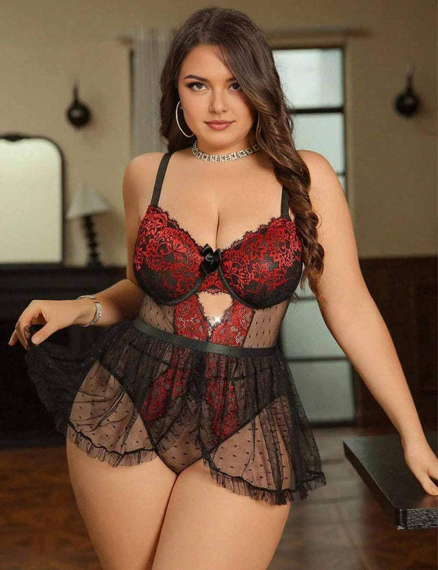 Women Plus Size Lace Contrast Mesh Bodysuit with Mini Skirt is part of the Plus Size Bodysuit.Designed specifically for plus-size women, this lace contrast mesh bodysuit with mini skirt offers both visual impact and wearable comfort. Lightweight, breathable materials feel soft against the skin, allowing you to move freely whether styled for a party, night out, or an intimate evening in. From the intricate lace accents to the curve-loving cut, this piece celebrates confidence, femininity, and modern sensuality—making it a standout addition to any plus-size lingerie or partywear collection.